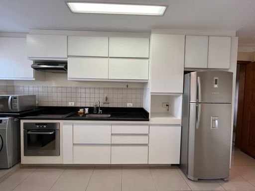 Com 60 m² de área construída, o imóvel oferece 2 dormitórios com armários planejados, camas confortáveis e uma charmosa varanda. O banheiro social já conta com box e gabinete. A sala de estar é integrada à cozinha planejada, equipada com geladeira, cooktop de indução, forno elétrico, coifa e micro-ondas — perfeita para quem valoriza funcionalidade e estilo no dia a dia. A lavanderia também é integrada e já está equipada com máquina lava e seca.