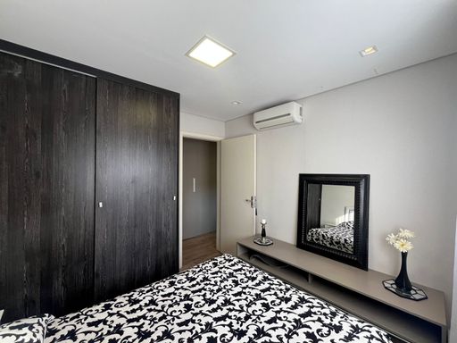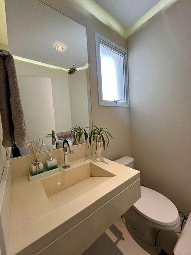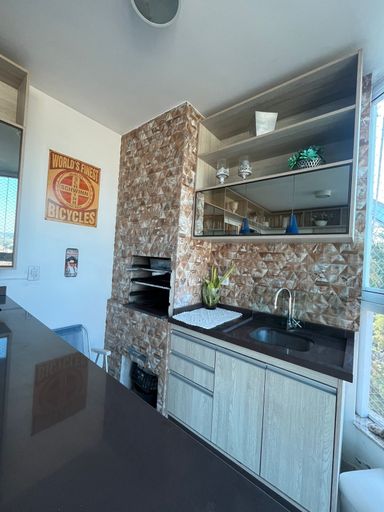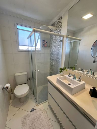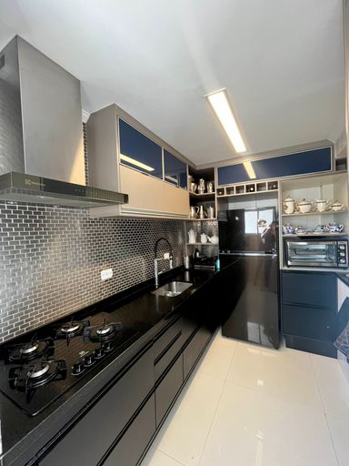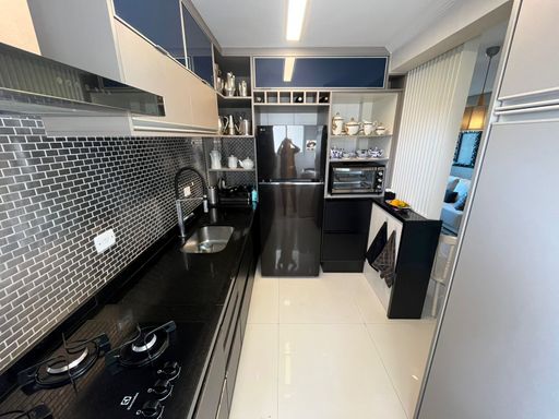 A cozinha planejada é moderna, funcional e já integrada à lavanderia. O apartamento ainda conta com um charmoso lavabo, ar-condicionado na sala e nos quartos, aquecedor a gás, acabamento de primeira qualidade e 2 vagas cobertas.