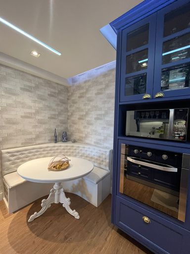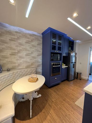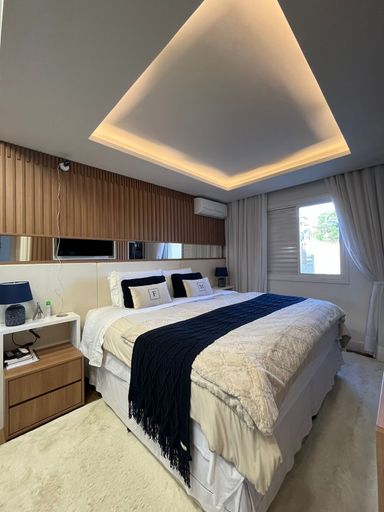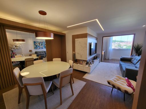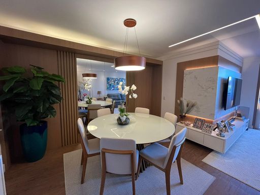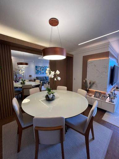 A sala de estar é ampla e harmoniosa, com teto rebaixado e um projeto de iluminação que valoriza cada ambiente. O painel de TV com iluminação em LED traz modernidade ao espaço, enquanto o ar-condicionado garante conforto térmico durante todo o ano. O bufê de jantar planejado complementa o ambiente, criando um espaço acolhedor para momentos especiais.