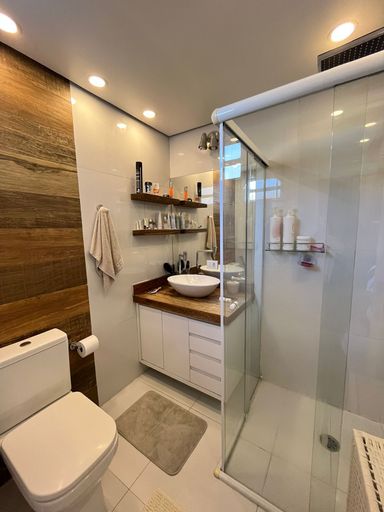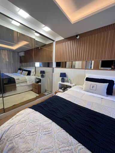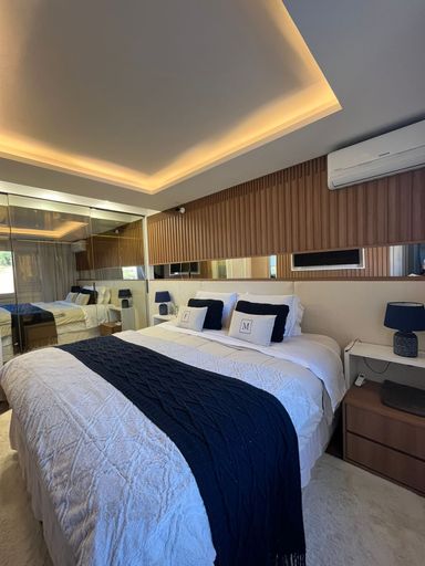 O imóvel dispõe de uma suíte cuidadosamente planejada, equipada com armários sob medida, cabeceira, painel para TV e ar-condicionado, proporcionando funcionalidade e elegância. Além dela, são mais dois dormitórios igualmente charmosos, sendo um deles adaptado como escritório planejado, com guarda-roupa com iluminação interna, ideal para quem trabalha em home office ou recebe visitas.
