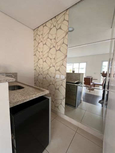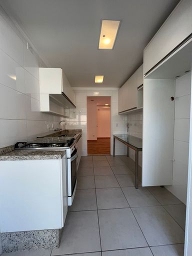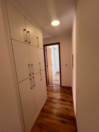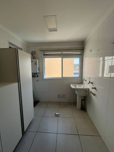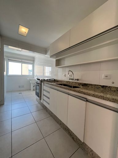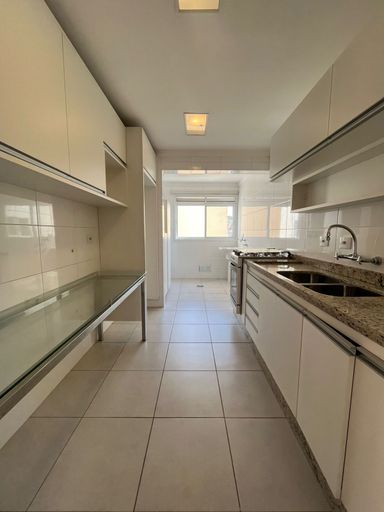 A cozinha é espaçosa e funcional, equipada com armários planejados e fogão embutido, integrada à lavanderia e com banheiro de serviço. O apartamento é rico em armários planejados, possui sistema de aquecimento a gás e dispõe de 2 vagas de garagem cobertas.