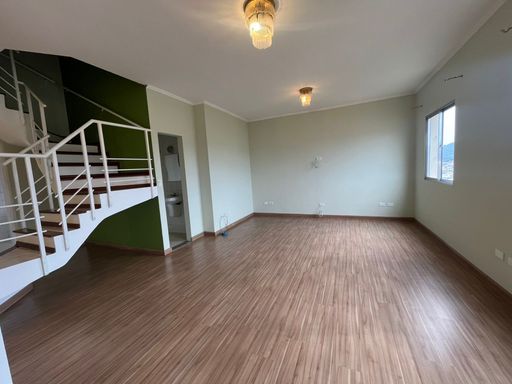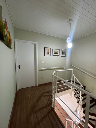 No piso superior, estão os 3 dormitórios, sendo 1 suíte com varanda envidraçada e closet planejado, além de uma sala íntima que pode ser utilizada como espaço de TV ou escritório. O imóvel dispõe ainda de duas vagas de garagem.