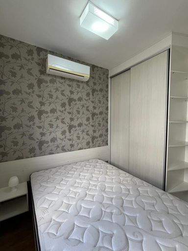 Subindo as escadas, chega-se ao refúgio íntimo do segundo pavimento: uma sala de TV acolhedora, com painel planejado e sofá confortável para até quatro pessoas; e duas suítes com armários sob medida e ar‑condicionado, garantindo conforto e privacidade em cada detalhe.