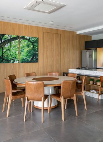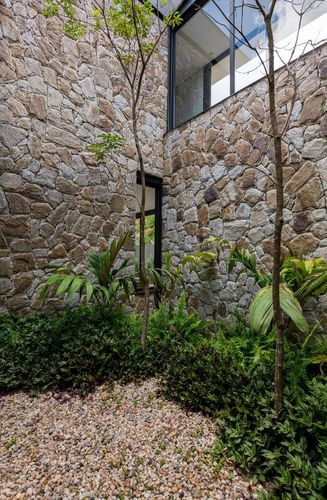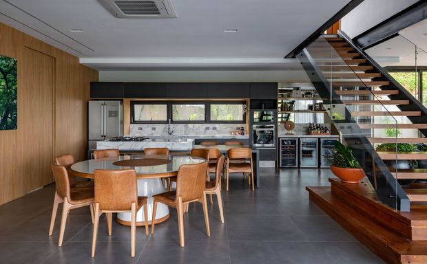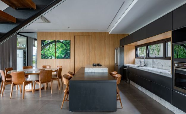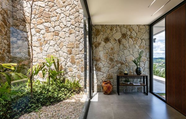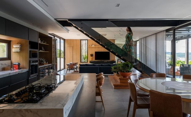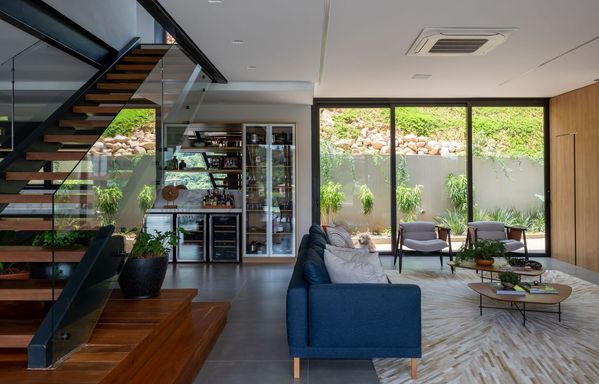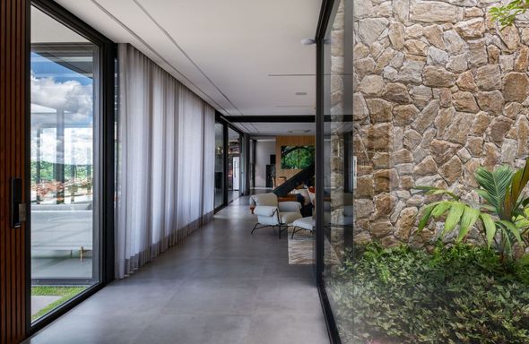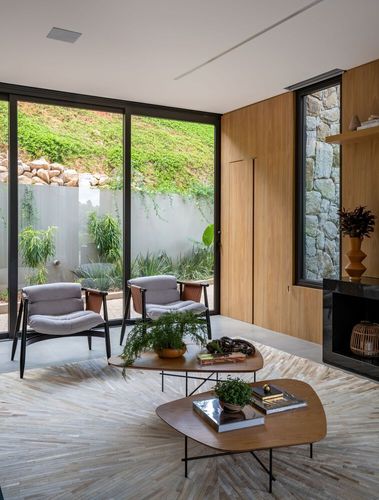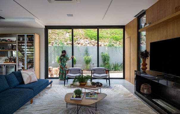 Logo na entrada, um jardim interno conecta visualmente os ambientes principais — sala de estar, sala de jantar e cozinha — proporcionando uma atmosfera acolhedora e elegante.