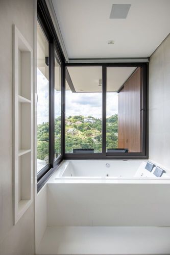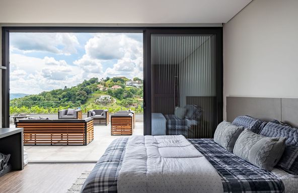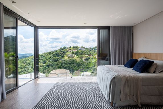 A residência dispõe de três dormitórios, todos com excelente aproveitamento de espaço e iluminação, sendo a suíte master um verdadeiro destaque: ampla, confortável, com closet e uma banheira de hidromassagem voltada para a paisagem natural — ideal para relaxar com privacidade e tranquilidade.