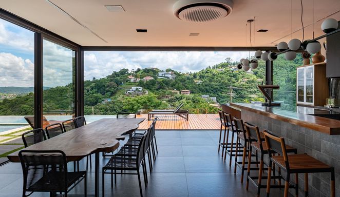 Na área externa, um espaçoso deck em madeira se abre a partir da área gourmet, criando o cenário perfeito para reunir amigos ou aproveitar momentos de descanso. A piscina de borda infinita, estrategicamente posicionada, se integra à natureza, oferecendo uma vista espetacular e única.
