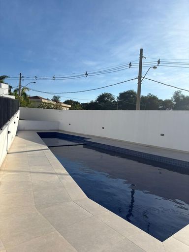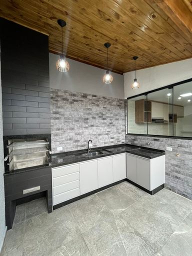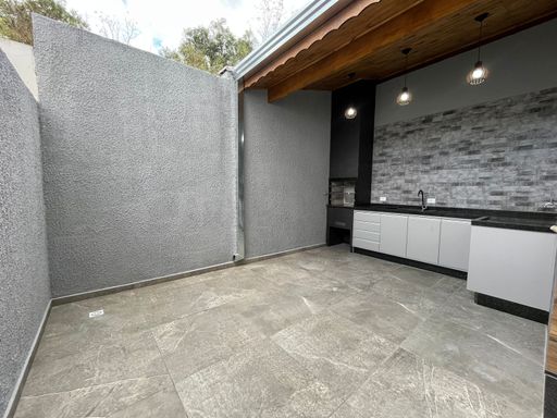 Nos fundos, o quintal foi transformado em uma deliciosa área gourmet coberta, com churrasqueira e armários planejados — ideal para reunir os amigos e aproveitar bons momentos.