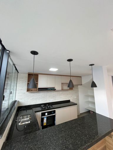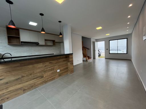 A sala é ideal para dois ambientes e se integra à cozinha planejada, equipada com cooktop e forno, formando um espaço moderno, funcional e acolhedor. No piso térreo, um lavabo complementa a área social.
