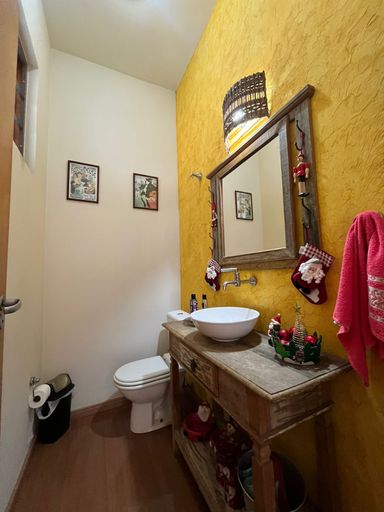 Um dos grandes diferenciais da casa é o porão generoso, que oferece uma sala de estar aconchegante, um dormitório extra, espaço para cozinha e banheiro, podendo ser usado como uma área independente para hóspedes, home office ou espaço de convivência.