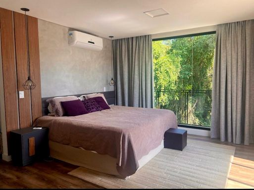 No andar superior, você encontra três amplas suítes no estilo americano, todas com varanda e uma vista deslumbrante para a piscina e a mata preservada. A suíte máster é um capítulo à parte, com dois closets e um banheiro espaçoso que inclui uma banheira de hidromassagem com vista para a natureza, criando um ambiente de puro relaxamento.