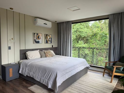 No andar superior, você encontra três amplas suítes no estilo americano, todas com varanda e uma vista deslumbrante para a piscina e a mata preservada. A suíte máster é um capítulo à parte, com dois closets e um banheiro espaçoso que inclui uma banheira de hidromassagem com vista para a natureza, criando um ambiente de puro relaxamento.