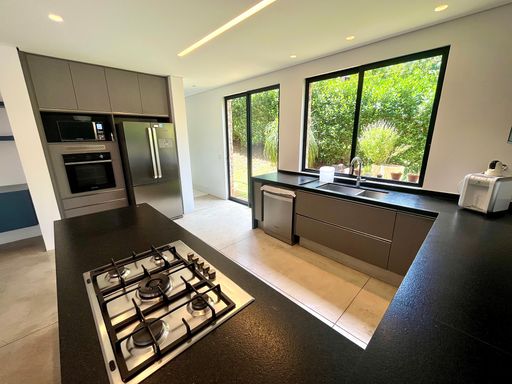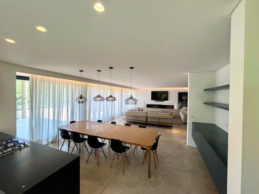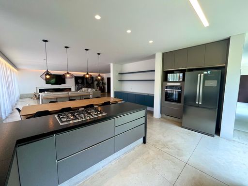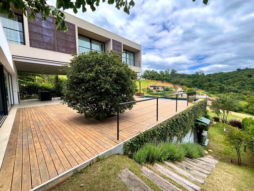 Para sua comodidade, a casa conta com 4 vagas de garagem, despensa, lavanderia e um quarto com banheiro para funcionários. O paisagismo é encantador, com lavandas, hortaliças e detalhes que refletem a integração perfeita entre o design e a natureza. A sustentabilidade também está presente, com placas solares para geração de energia, iluminação de alta qualidade da Lumini e acabamentos premium, como os metais Hansgrohe e os móveis planejados da Bontempo.