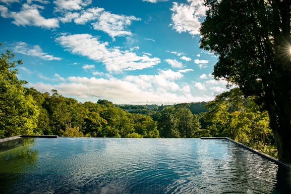 Para momentos de lazer e relaxamento, a pousada oferece uma piscina de borda infinita com uma vista deslumbrante, além de um lindo lago que completa o cenário, criando um ambiente sereno e encantador.