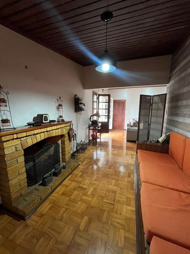 Um living com lareira que pode ser adaptado como sala de atendimento ou escritório;