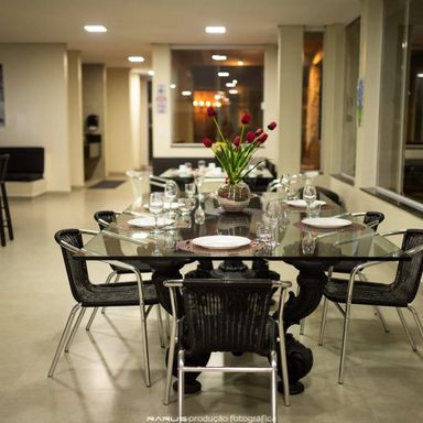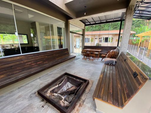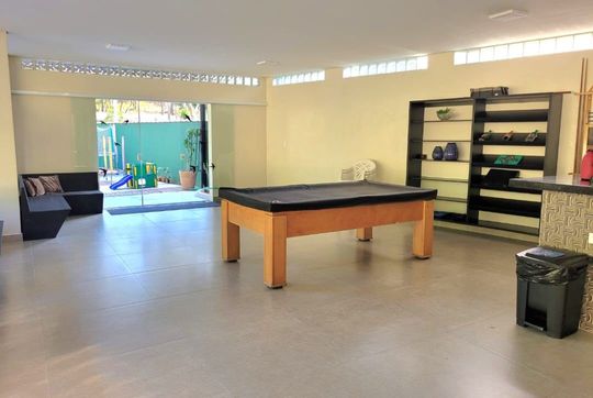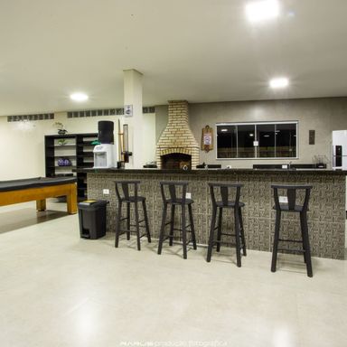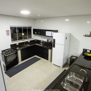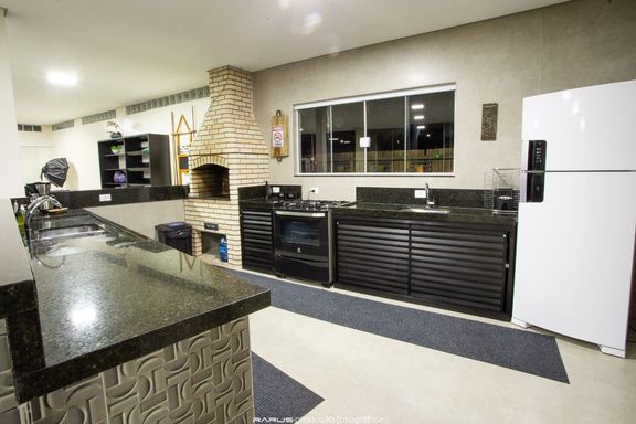 A área comum é um verdadeiro convite ao bem-estar: sala de TV aconchegante, amplo salão com ambientes integrados, duas cozinhas totalmente equipadas, churrasqueira, mesa de sinuca e até espaço para fogueira – perfeito para noites agradáveis sob o céu estrelado.