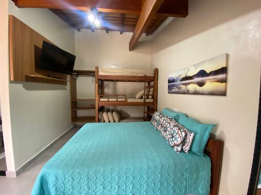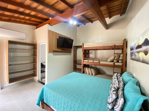 São duas suítes independentes da área de lazer, equipadas com camas, beliches e ar-condicionado, garantindo conforto e privacidade aos hóspedes.